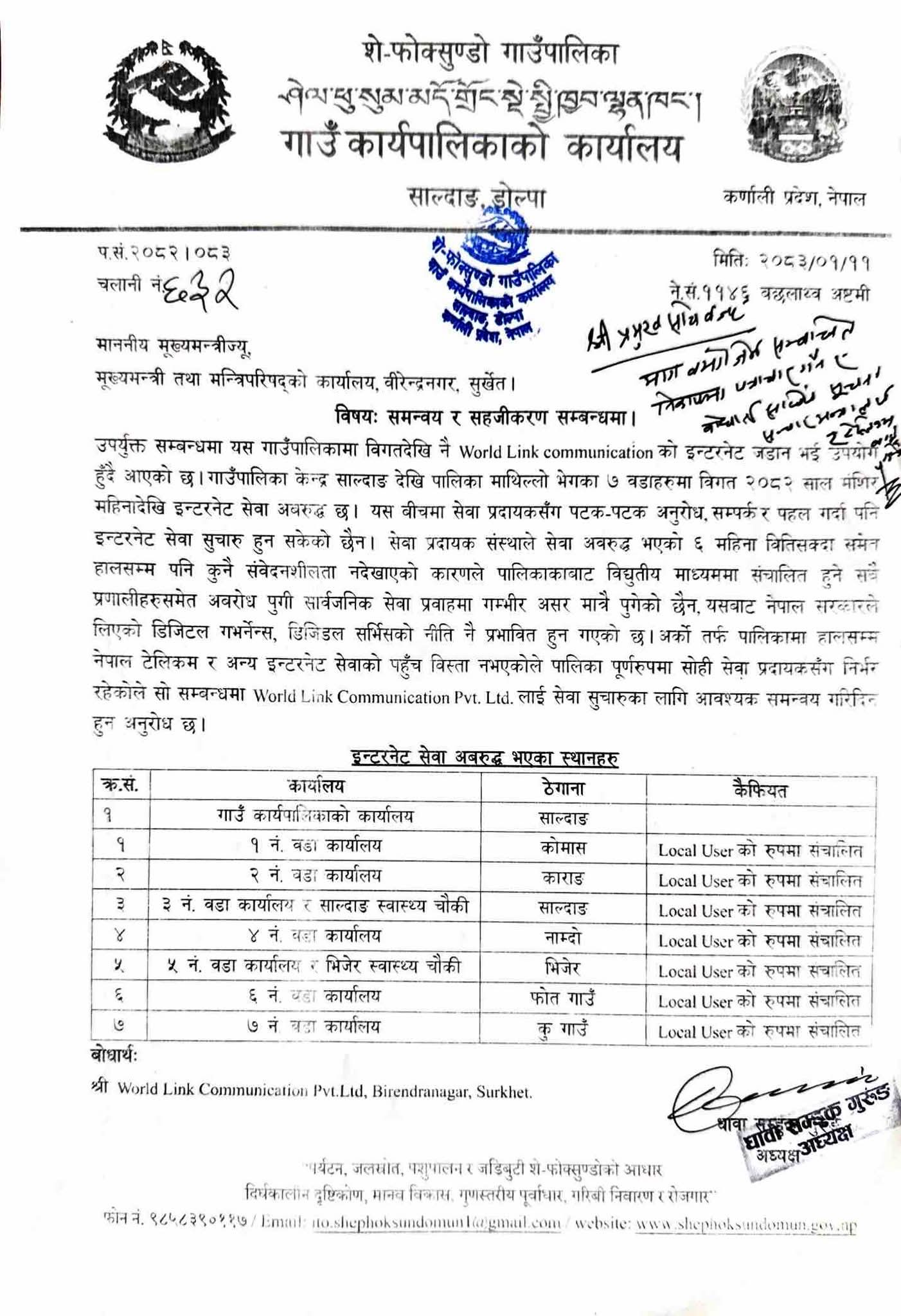 यसैबीच, गाउँपालिकाका माथिल्ला ७ वटा वडामा लामो समयदेखि इन्टरनेट सेवा अवरुद्ध रहेको विषय पनि भेटमा उठाइएको पालिकाले जनाएको छ। वर्ल्डलिङ्क कम्युनिकेशनमार्फत सञ्चालित सेवा विगत करिब ६ महिनादेखि प्रभावकारी रूपमा सञ्चालन हुन नसक्दा डिजिटल सेवा, शैक्षिक गतिविधि तथा सार्वजनिक सेवा प्रवाहमा समस्या उत्पन्न भएको गाउँपालिकाको भनाइ छ। सेवा प्रदायकसँग पटक–पटक समन्वय गर्दा पनि समस्या समाधान नभएकाले प्रदेश सरकारमार्फत आवश्यक पहल गर्न अनुरोध गरिएको हो।